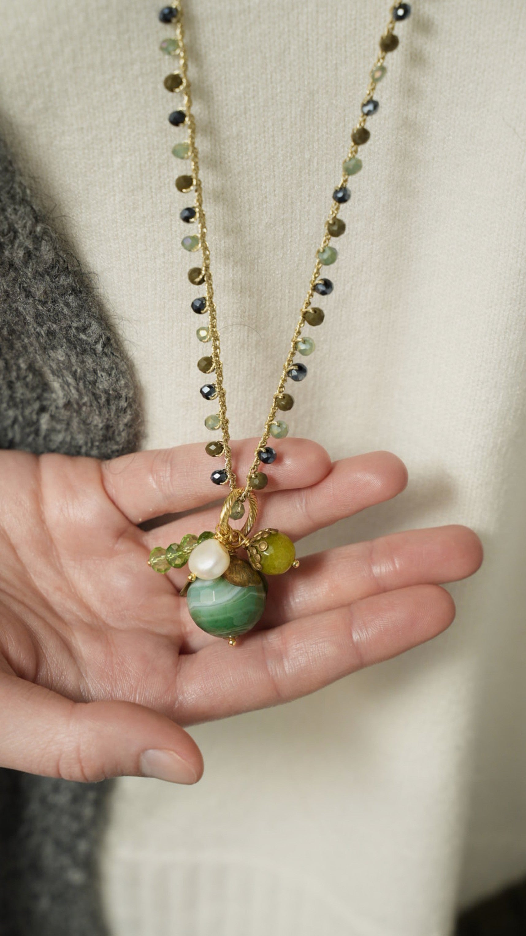 Collana realizzata interamente a mano con tecnica ad uncinetto, filo lurex, cristalli di vetro, pietre naturali, perla naturali.