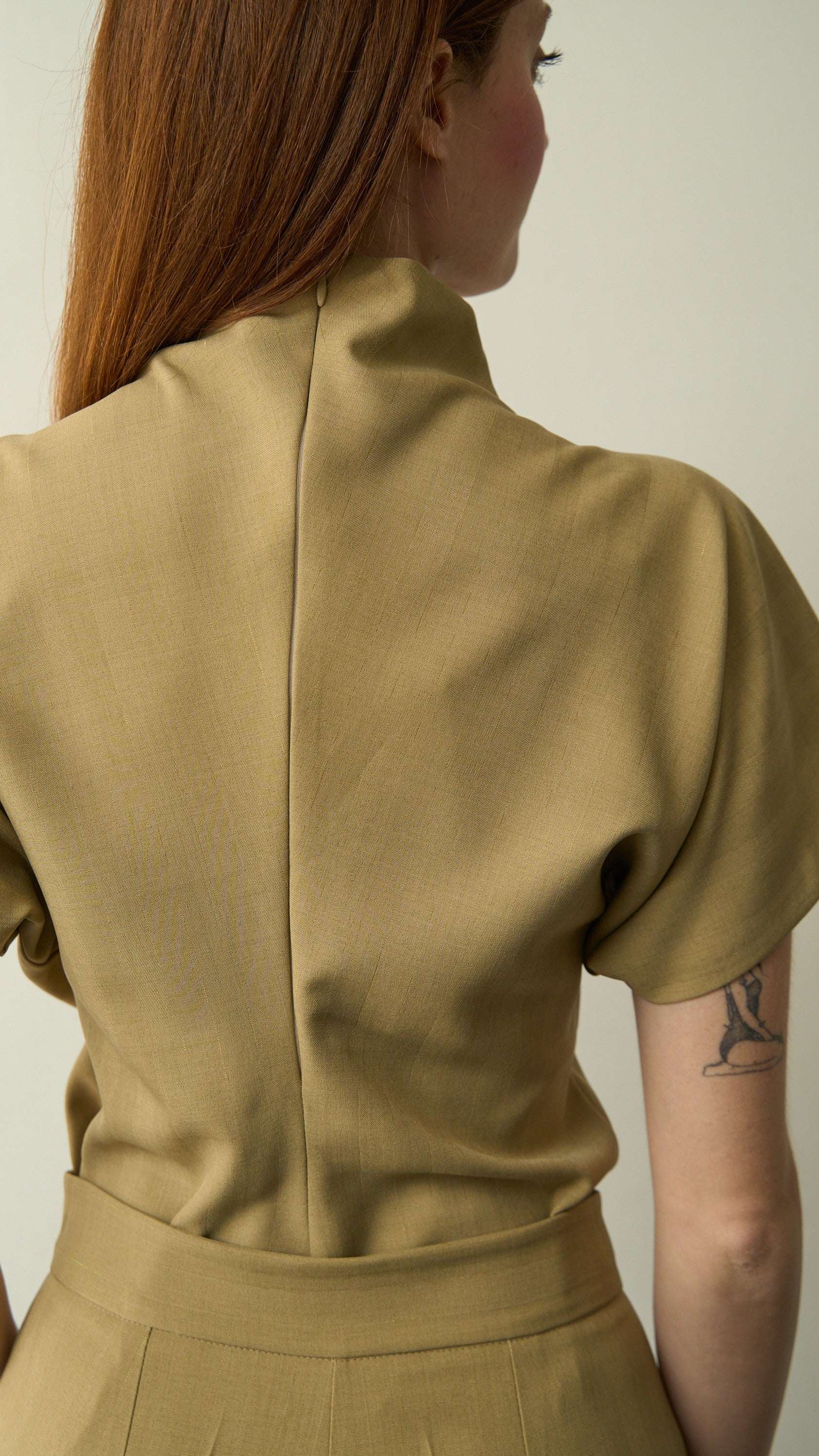 Top avvitato e impreziosito da un'impercettibile trama lurex che dona un delicato tocco luminoso. Il taglio valorizza la silhouette, definendo il punto vita con naturale eleganza. Raffinato e contemporaneo, perfetto con i pantaloni coordinati per un completo ricercato.
