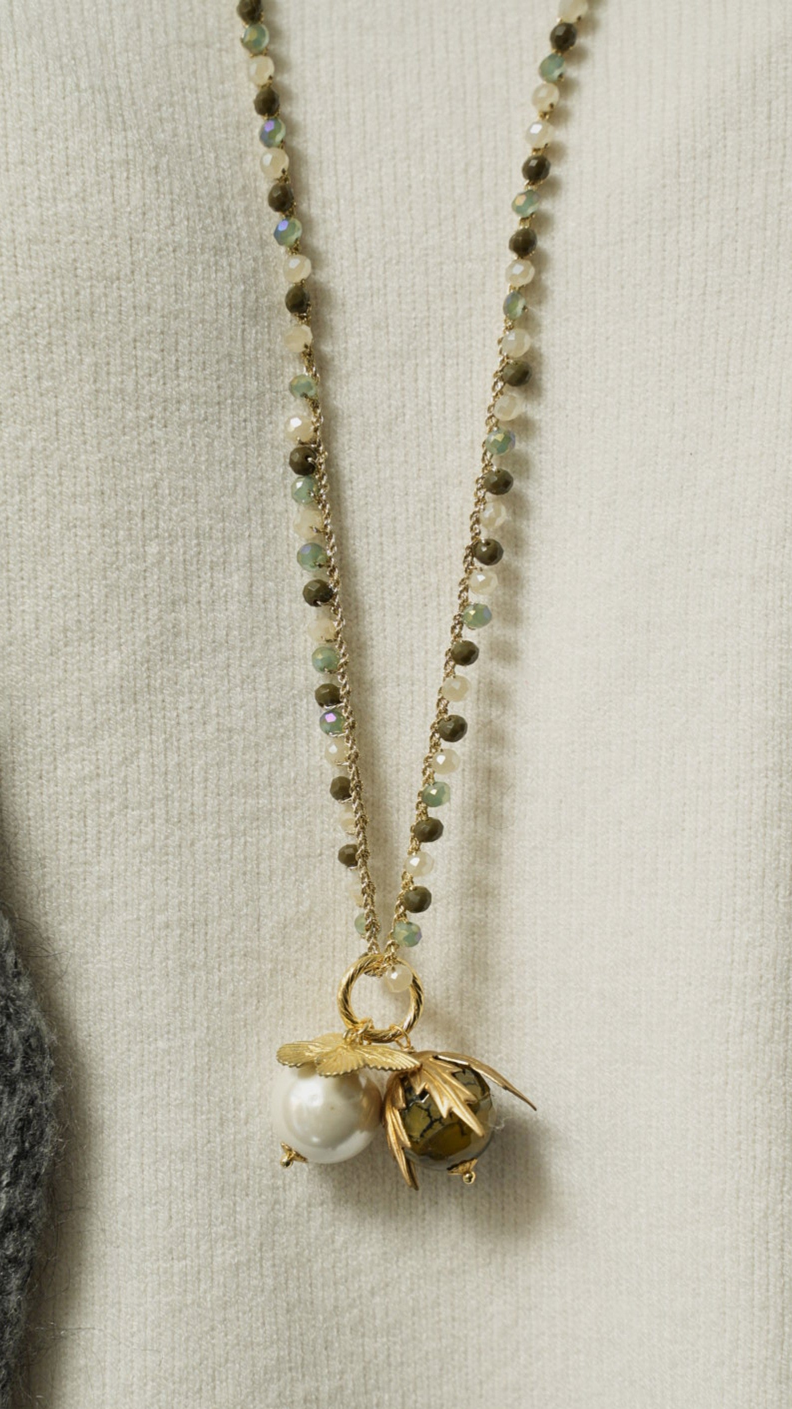 Collana realizzata interamente a mano con tecnica ad uncinetto, filo lurex, cristalli di vetro, pietre naturali, perla naturali e charm in acciaio.