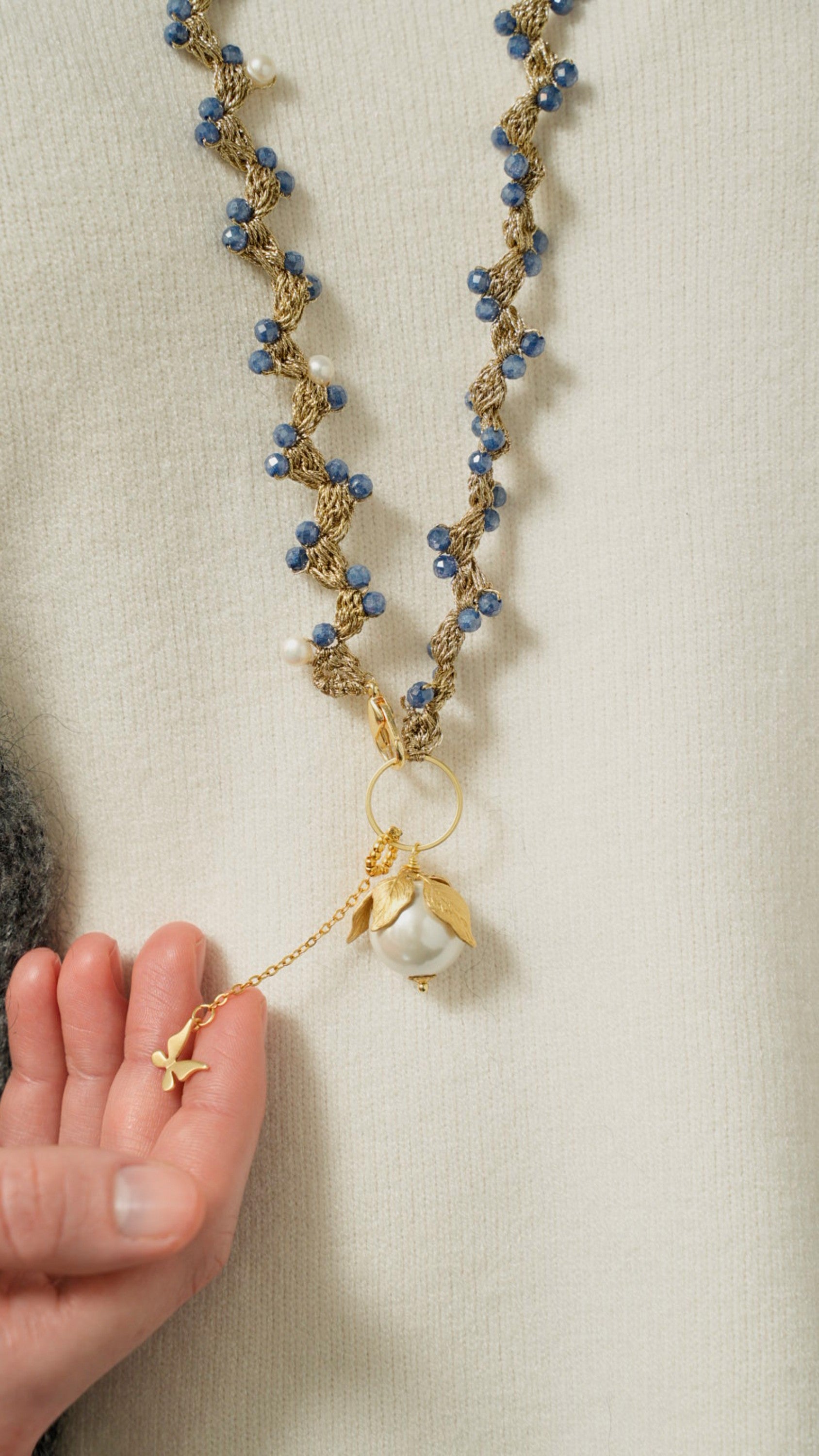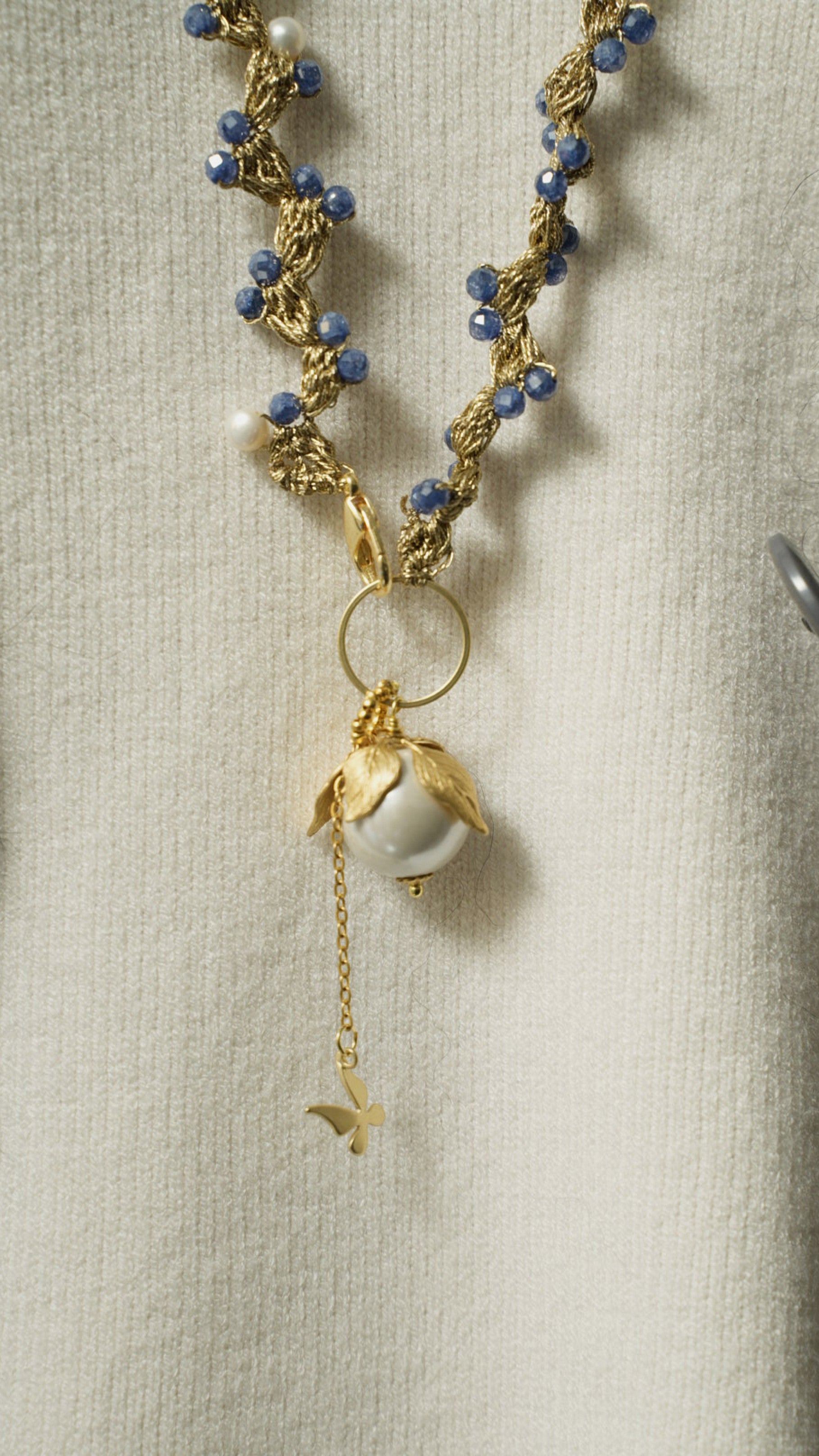 Collana realizzata interamente a mano con tecnica ad uncinetto, filo lurex, zirconi e perle naturali.