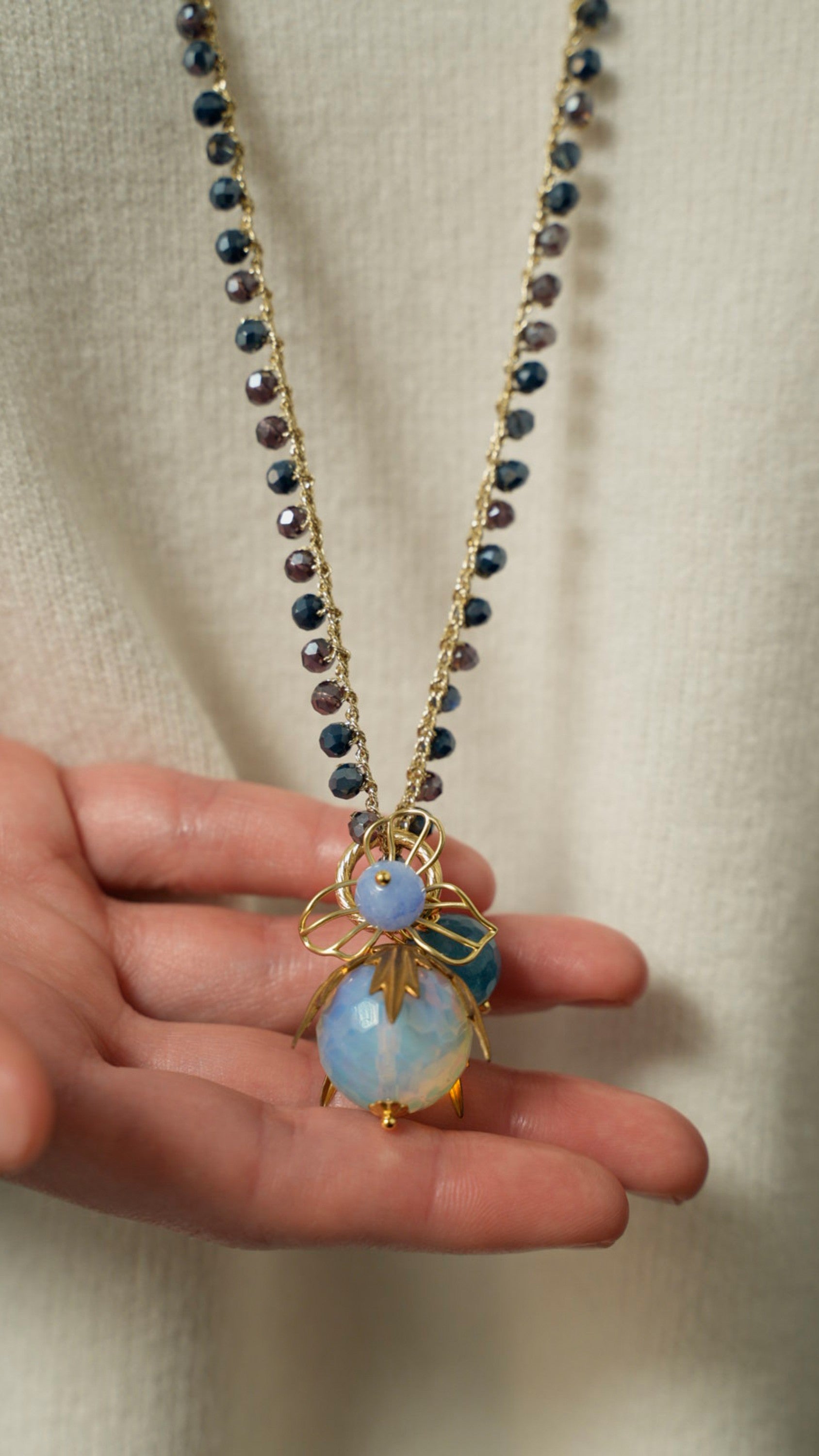 Collana realizzata interamente a mano con tecnica ad uncinetto, filo lurex, cristalli di vetro, pietre naturali e charm in acciaio.