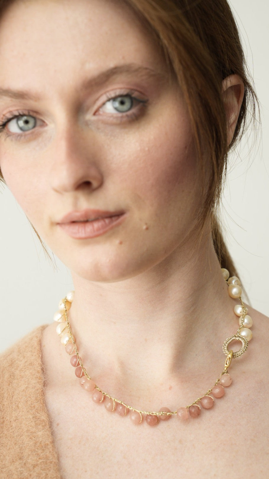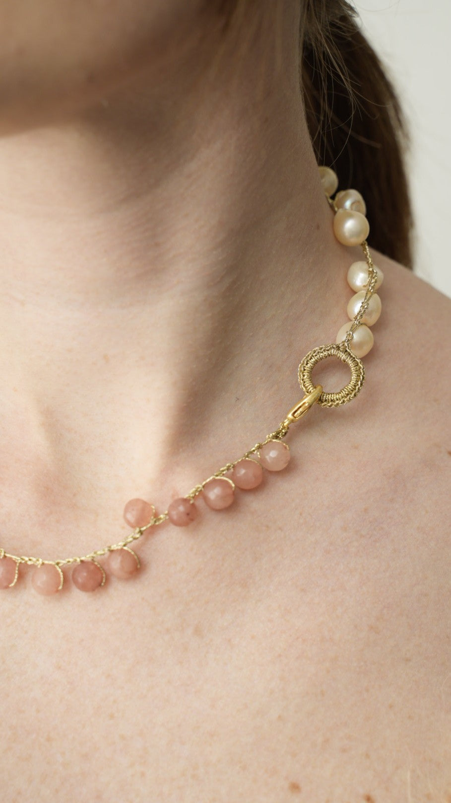 Girogola realizzato interamente a mano con tecnica ad uncinetto, filo lurex, pietre dure e perle naturali.