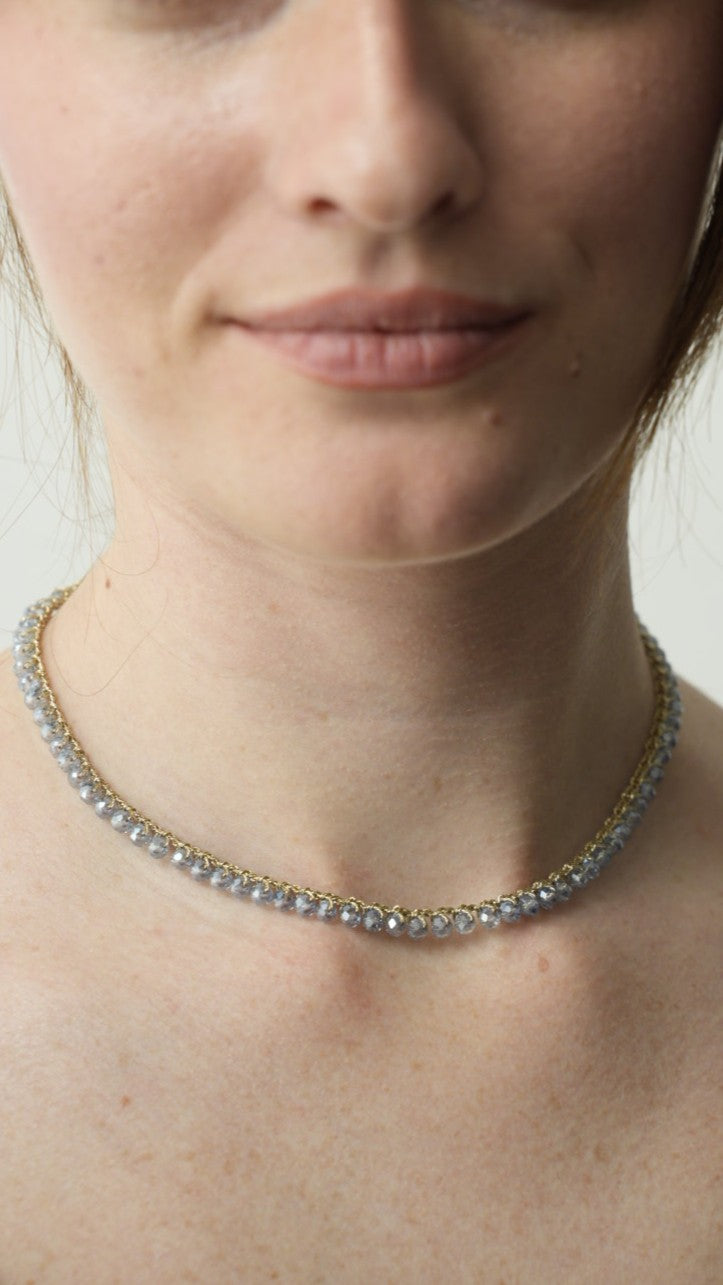 Girogola realizzato interamente a mano con tecnica ad uncinetto, filo lurex e cristalli di vetro.