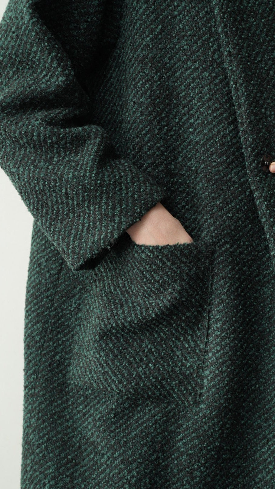 Cappotto cucito interamente a mano in 70% lana e 30% poliestere. Veste dalla taglia 40 alla 46.