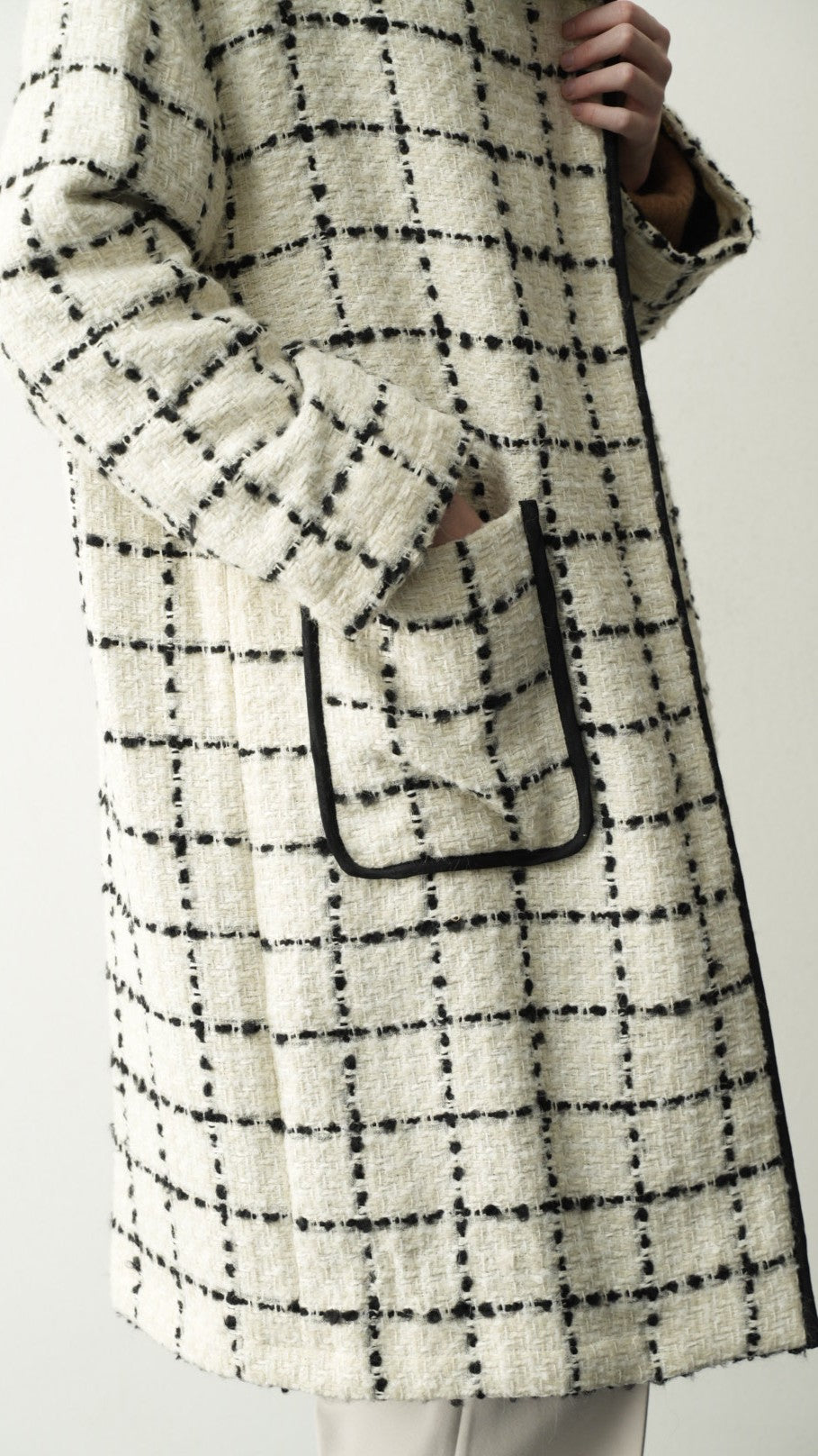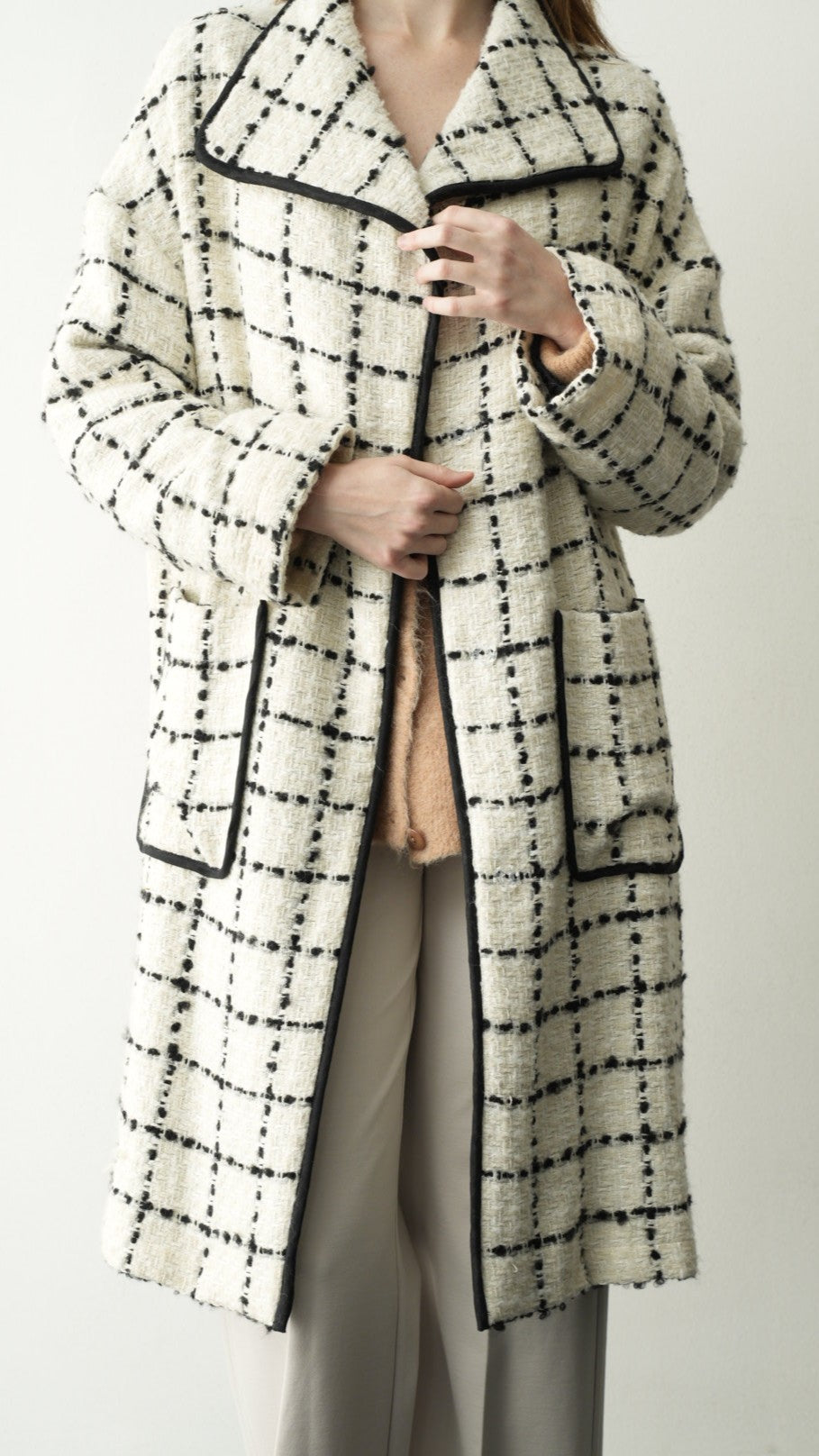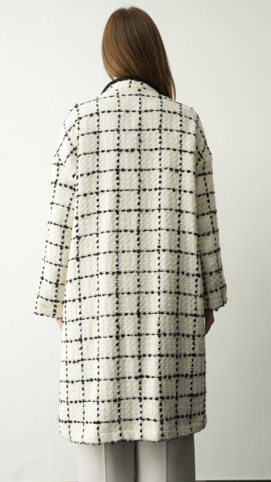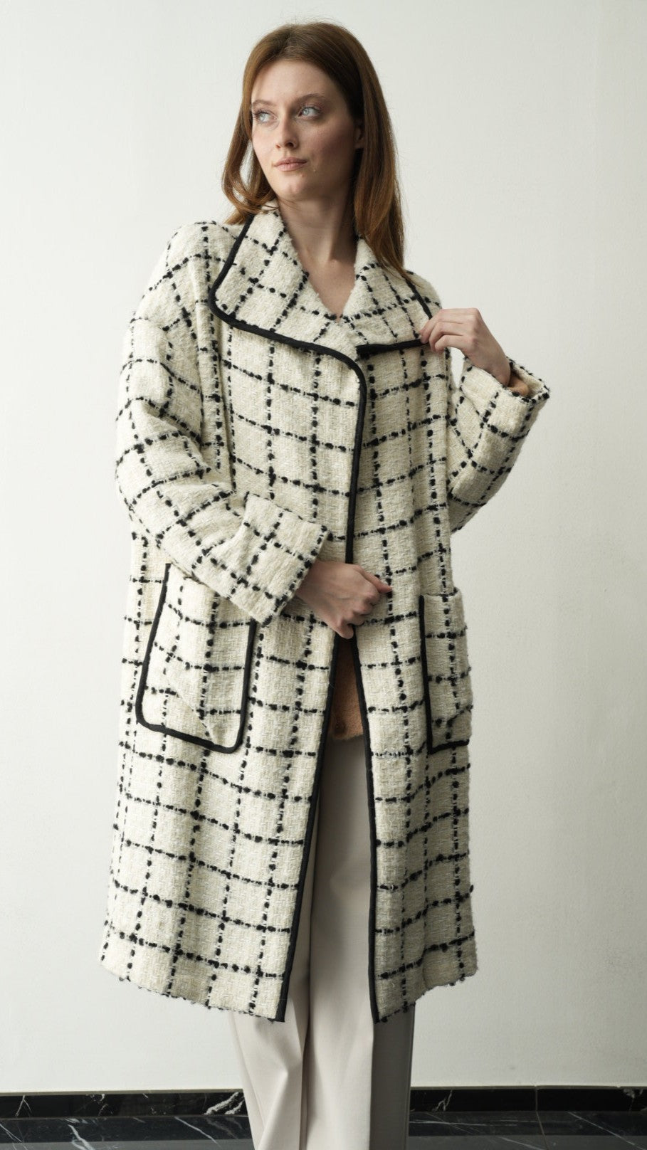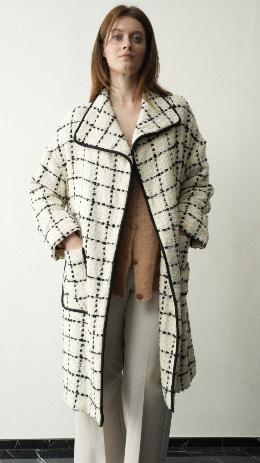 Cappotto cucito interamente a mano in 70% lana e 30% poliammide. Vestibilità ampia, veste dalla taglia 40 alla 48.