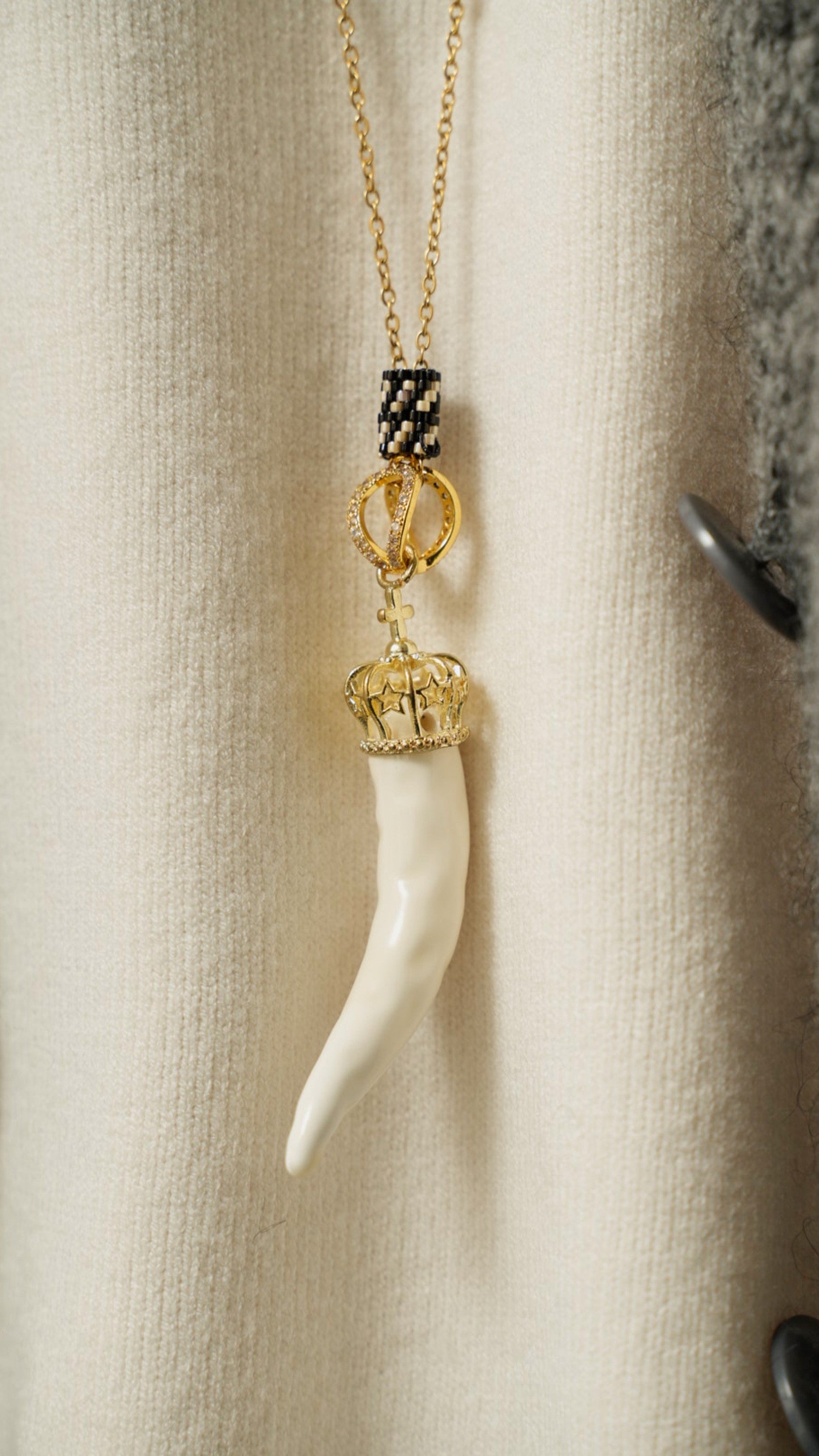 Collana realizzata a mano con catena in acciaio inossidabile, tubicino tecnica peyote e corno in ceramica.