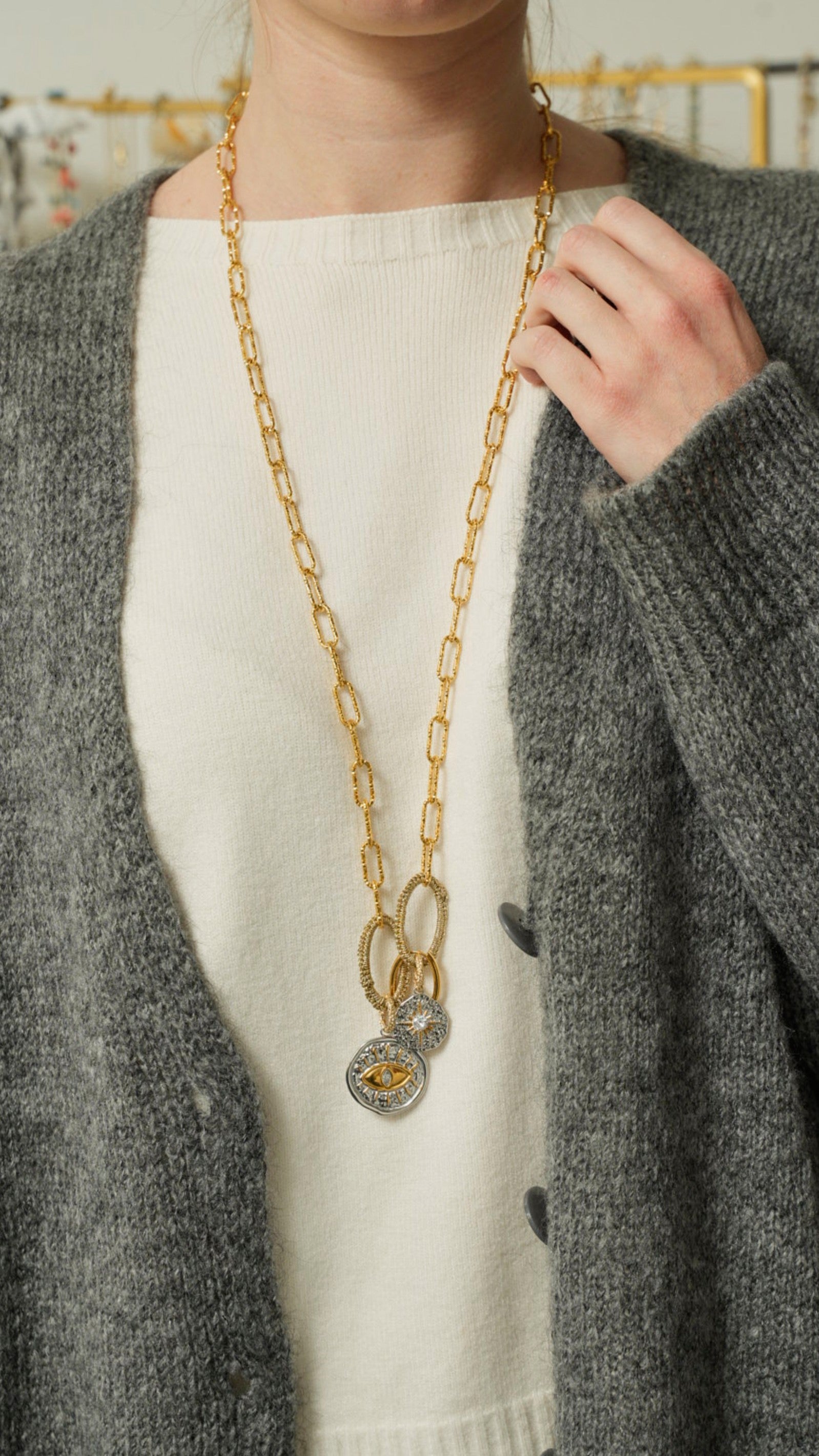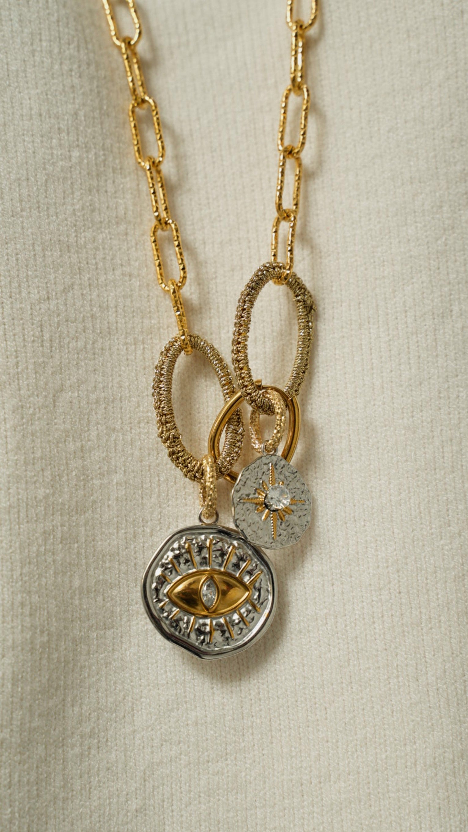 Collana realizzata a mano, con catena e charms in acciaio inossidabile, ovali rivestiti con lavorazione ad uncinetto.