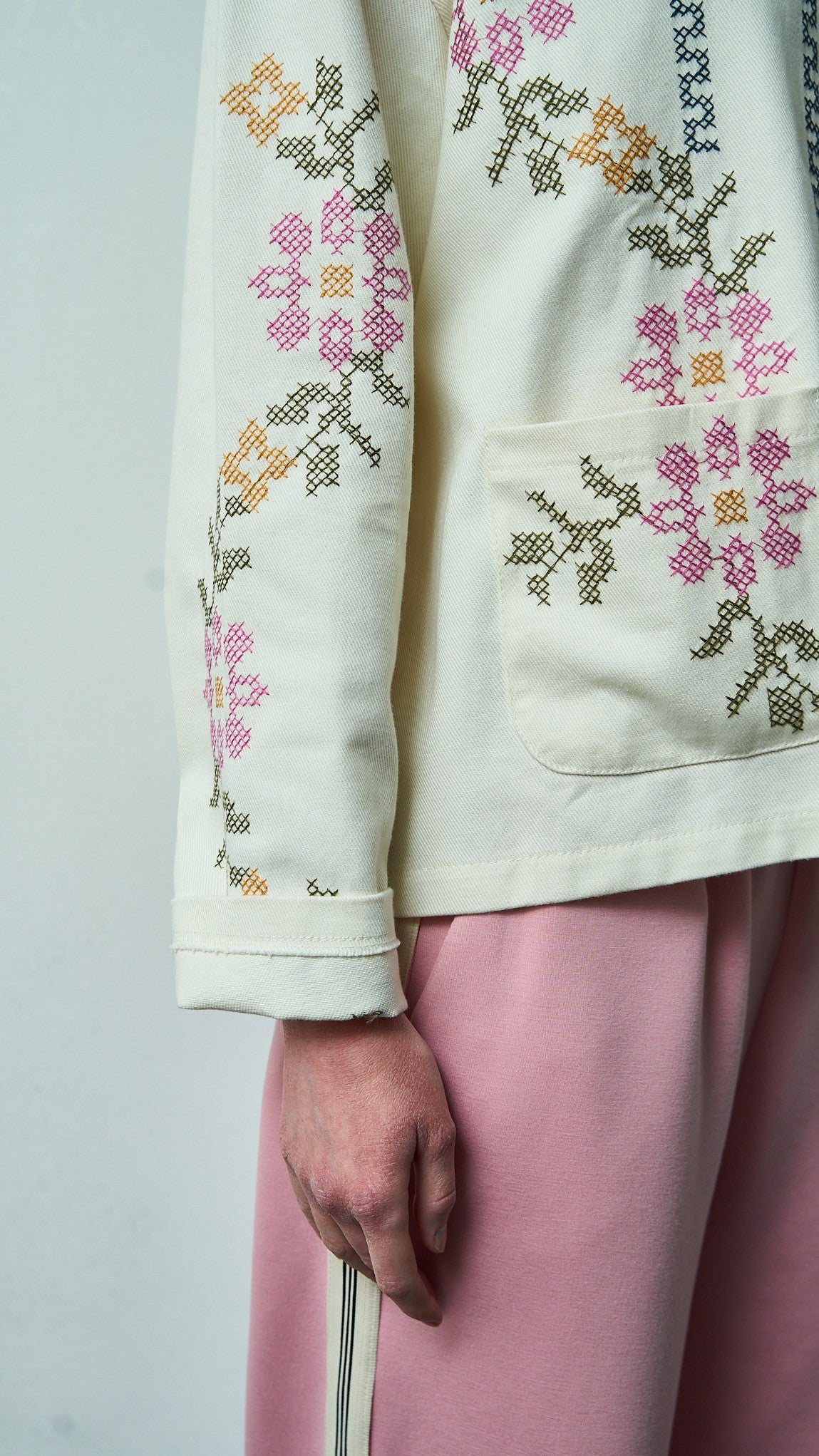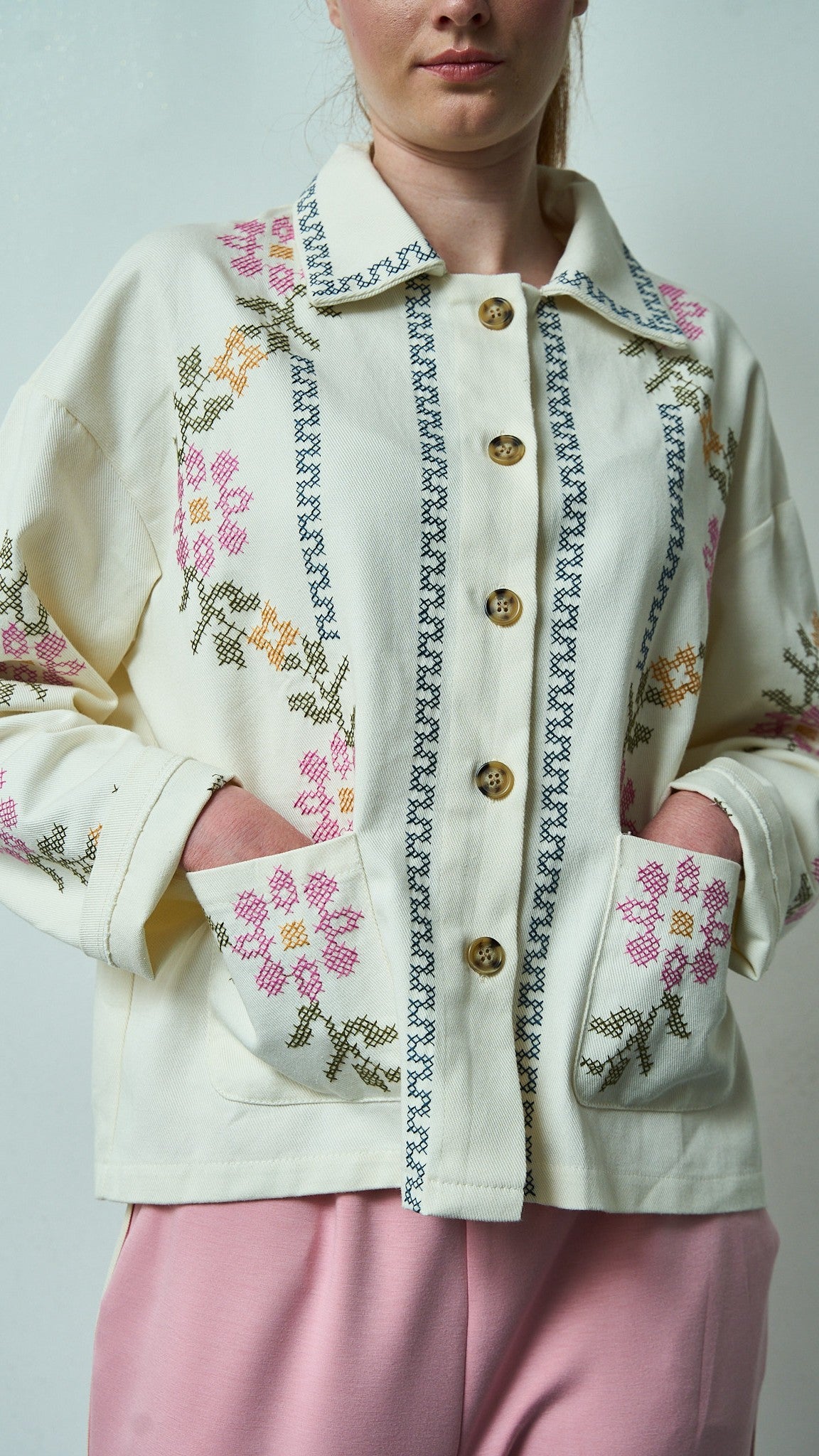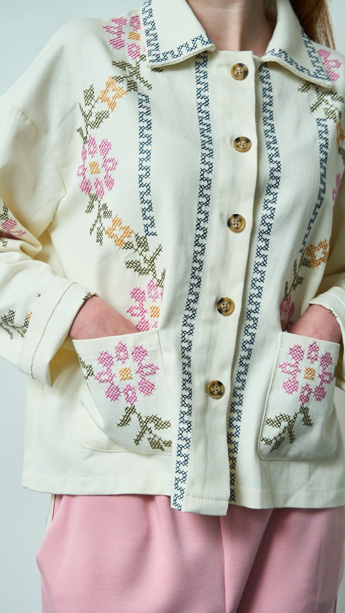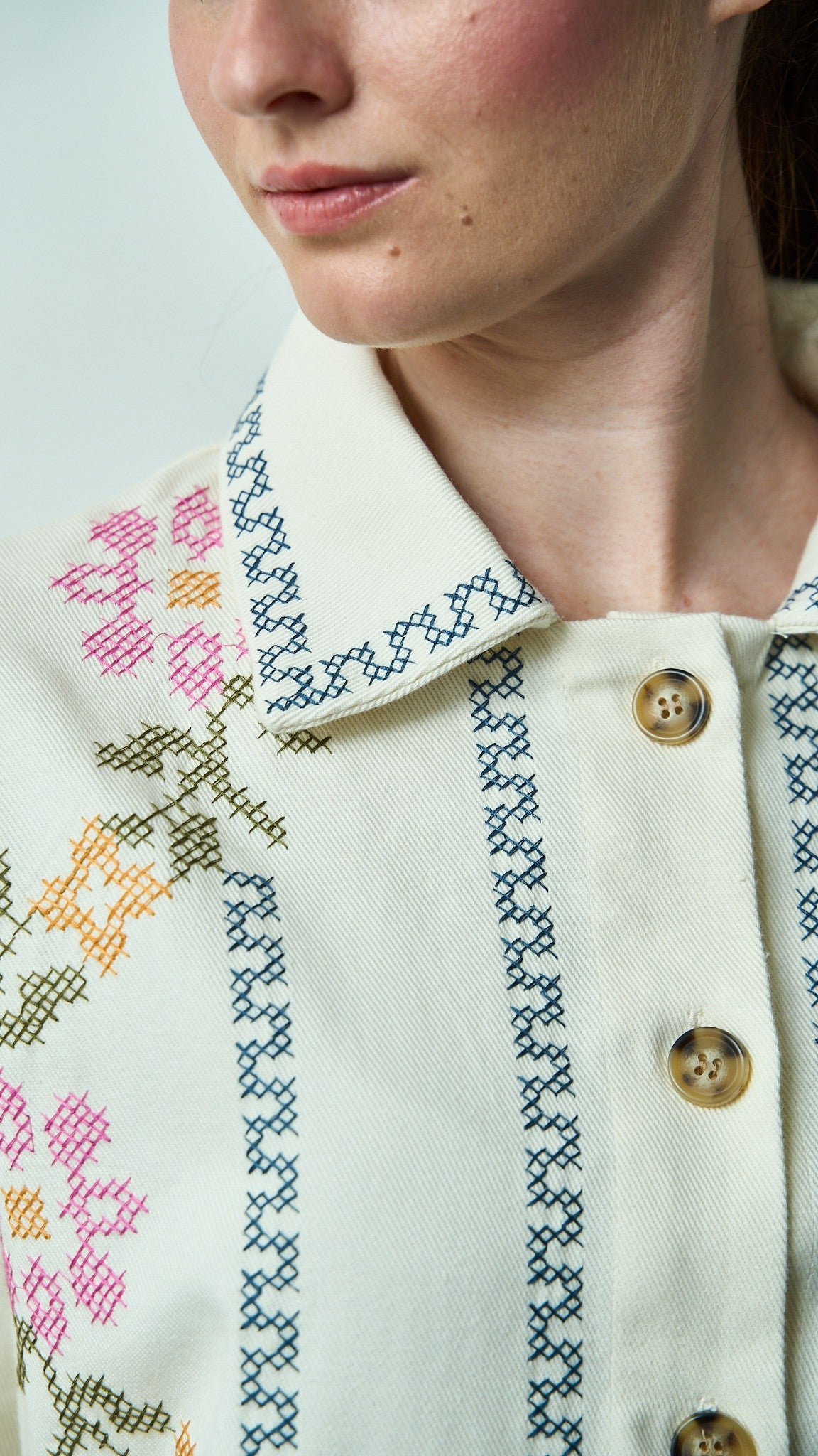 Camicia color ecru impreziosita da ricami floreali a punto croce dai toni delicati. Raffinata e curata, perfetta per un look romantico e versatile.
