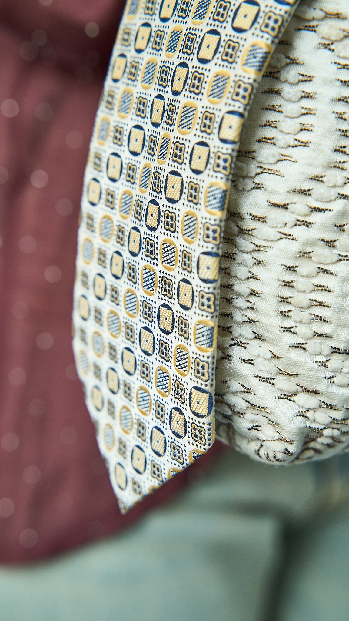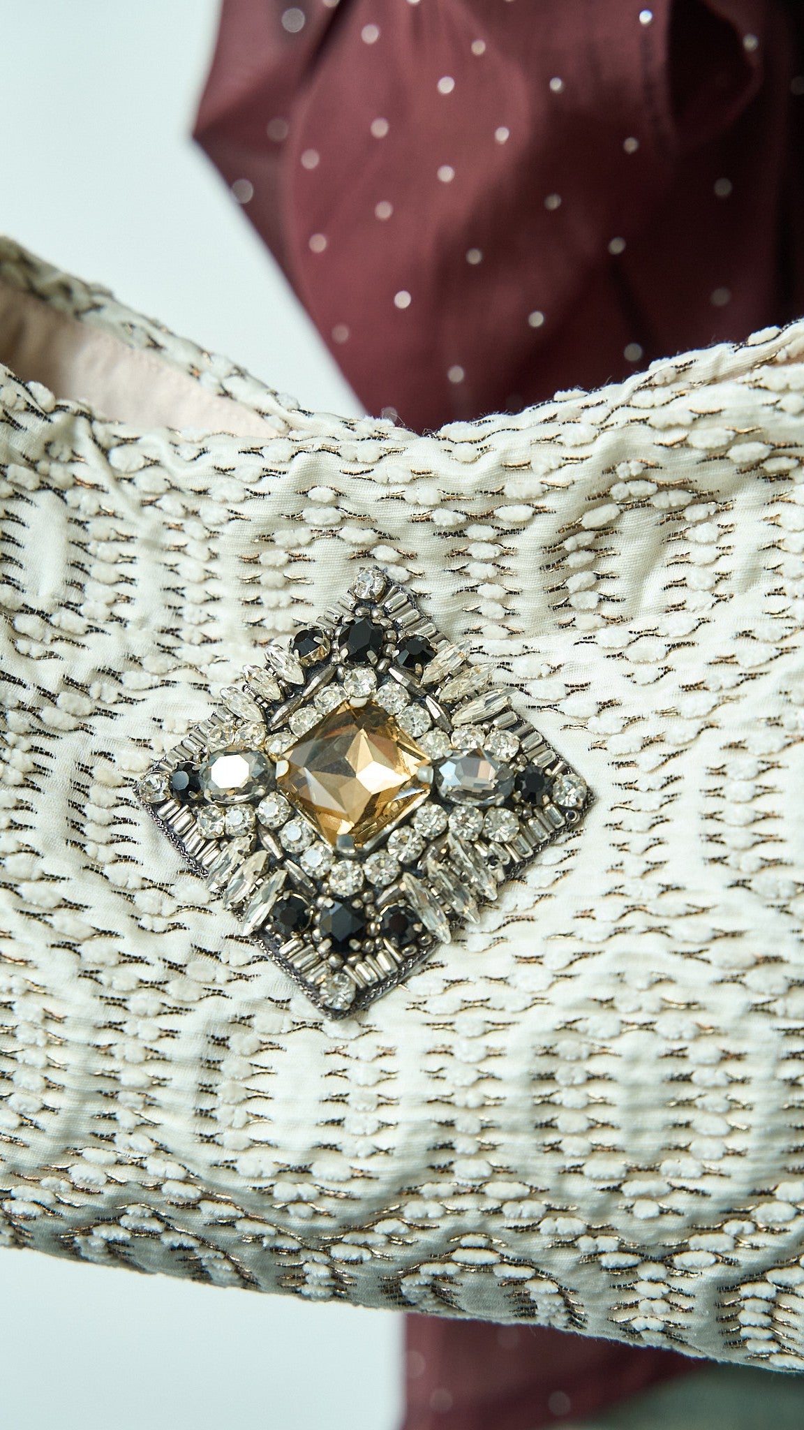 Borsa dal design originale, realizzata interamente a mano. Il manico in cravatta e la spilla decorativa removibile la rendono un accessorio unico e distintivo.