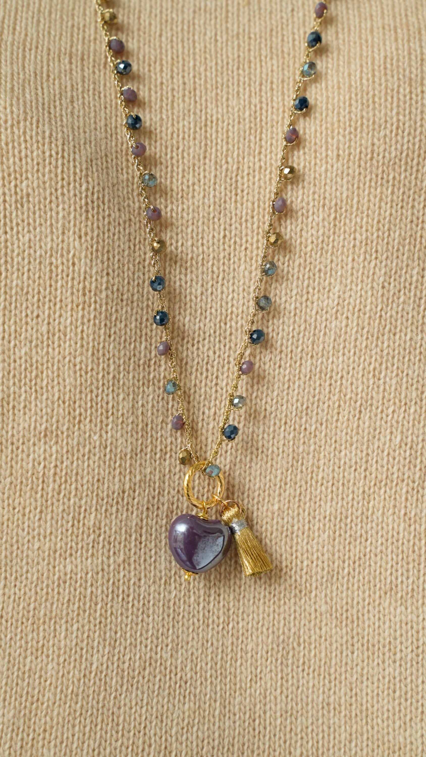 Collana realizzata interamente a mano con tecnica ad uncinetto, filo lurex, cristalli di vetro e charm in ceramica e nappina in seta.