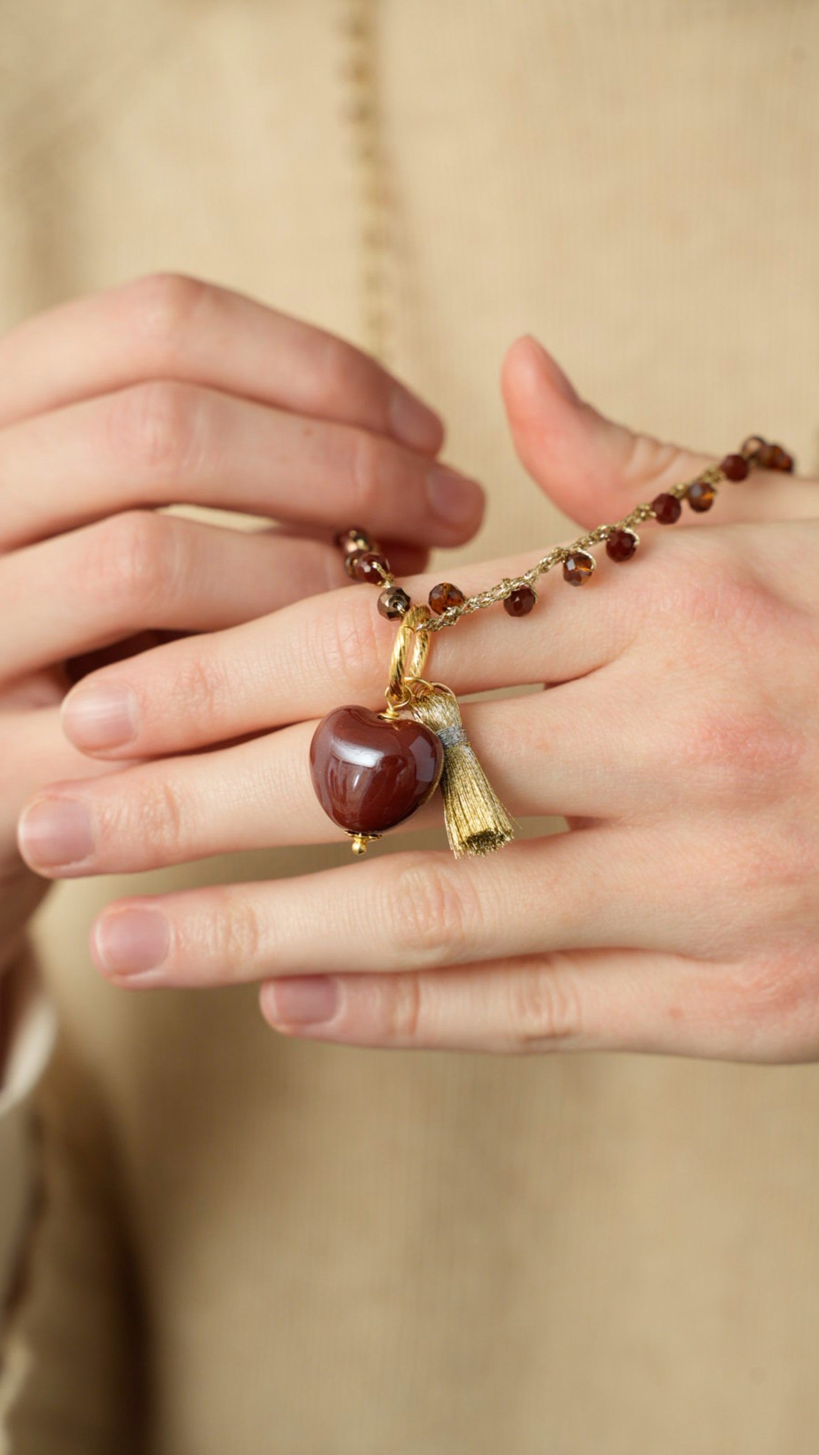 Collana realizzata interamente a mano con tecnica ad uncinetto, filo lurex, cristalli di vetro, charm in ceramica e nappina in seta.