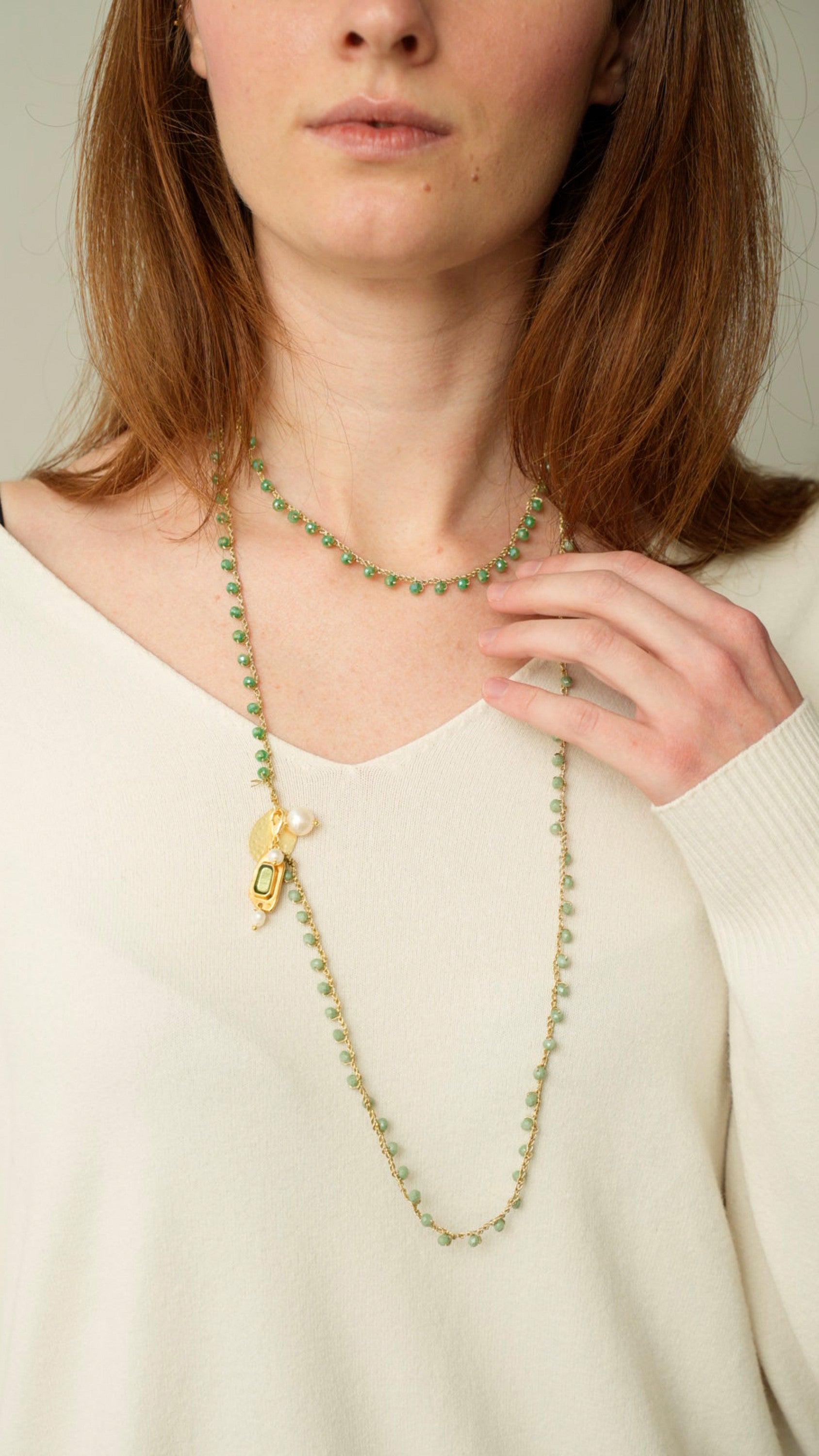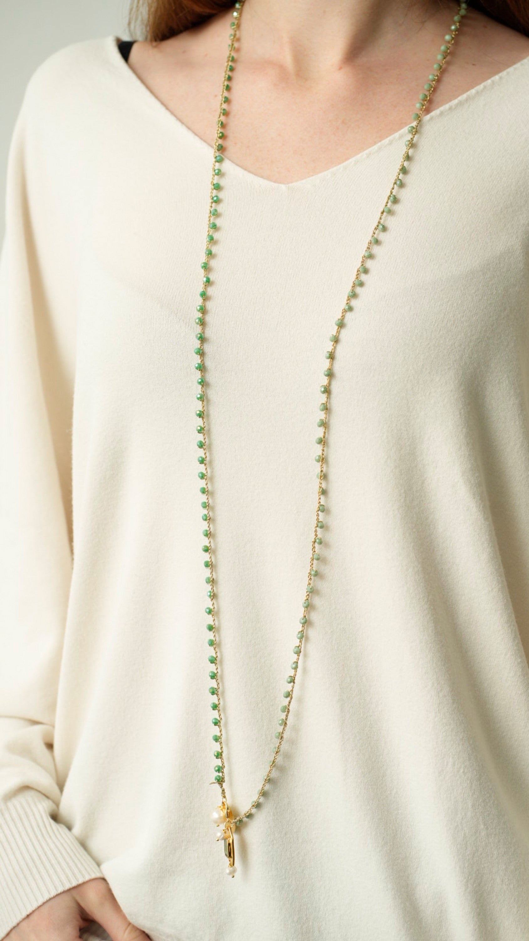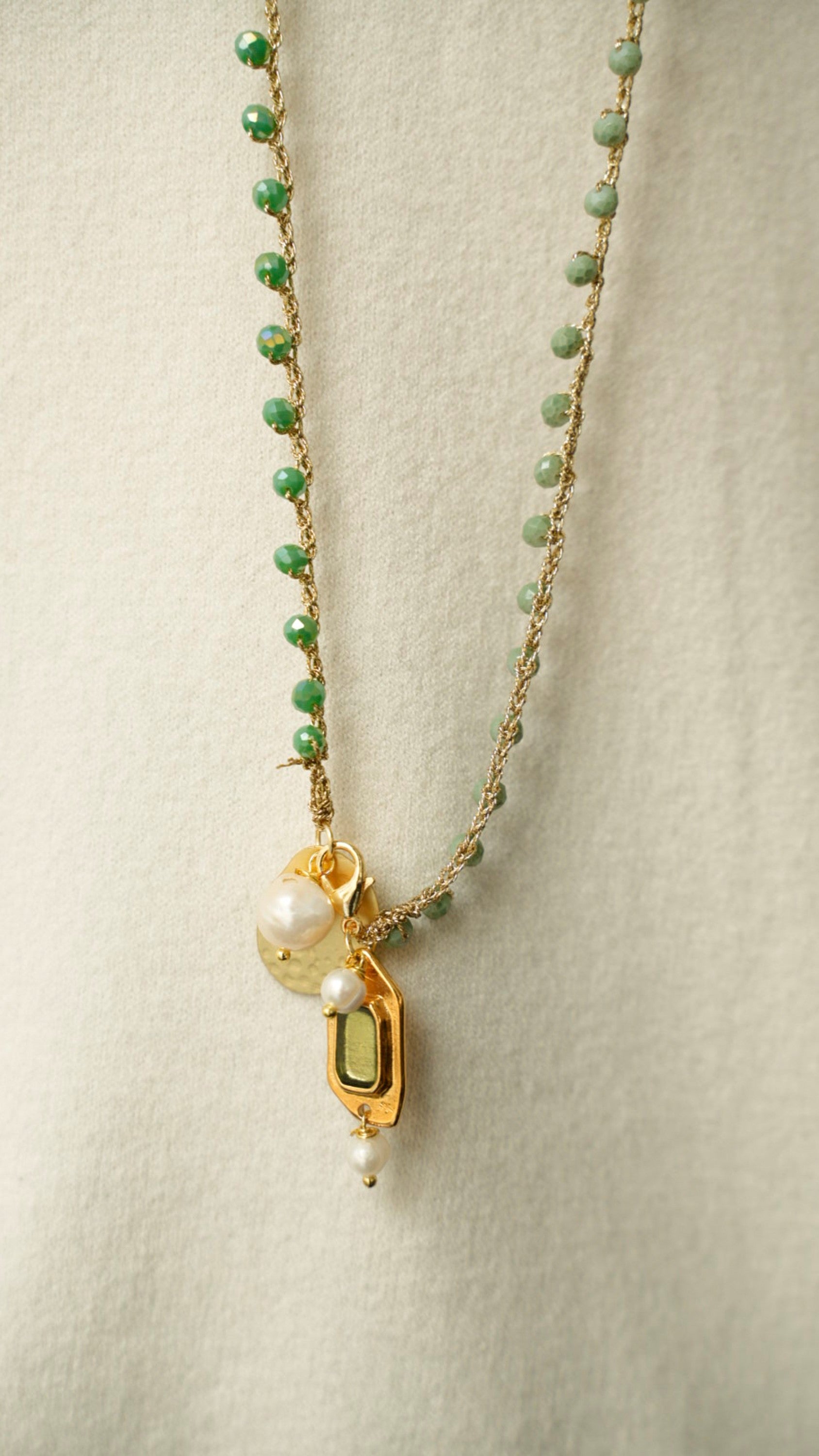 Collana realizzata interamente a mano con tecnica ad uncinetto, filo lurex, cristalli di vetro e charms in acciaio e ottone smaltato/galvanizzato.