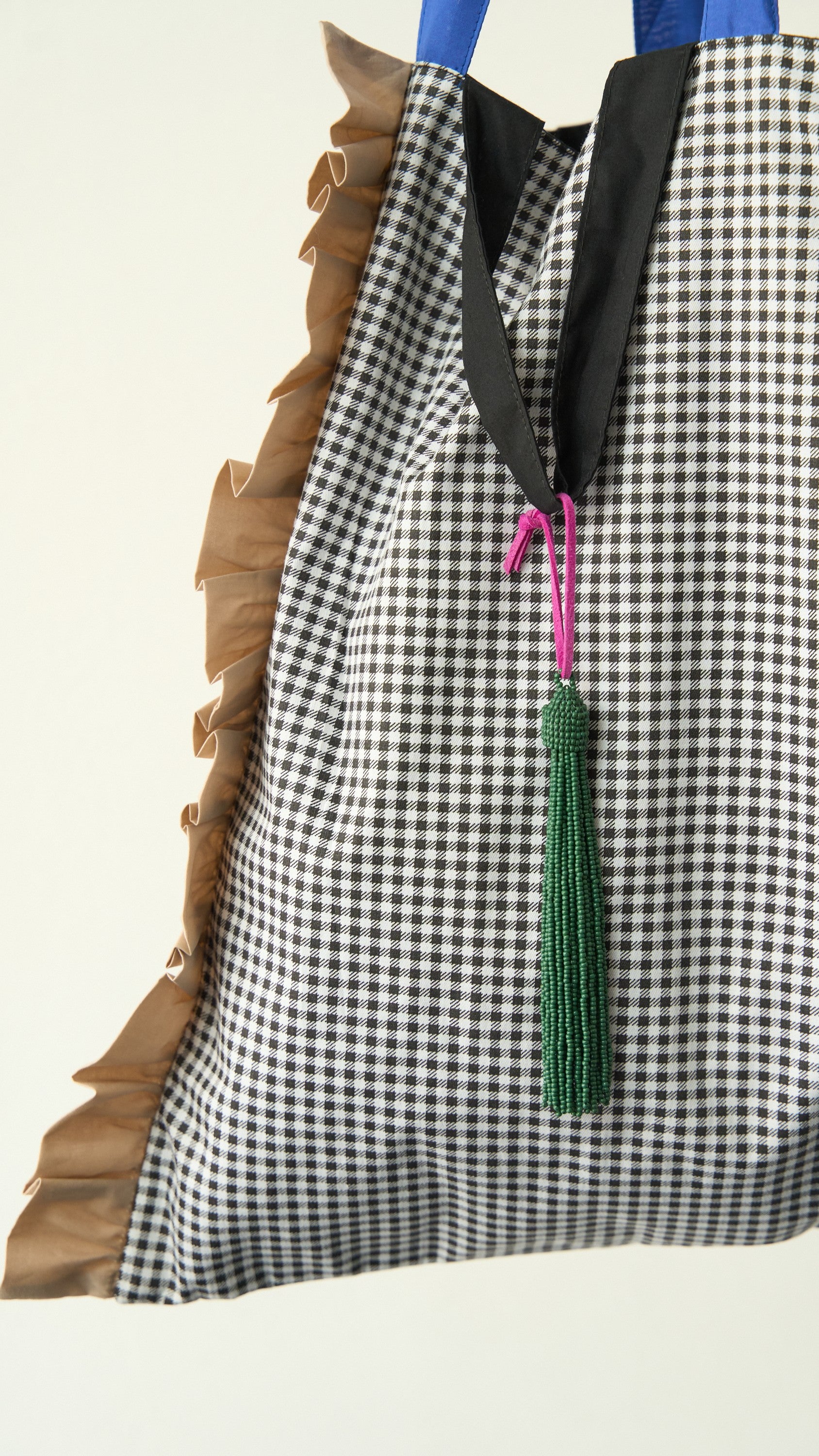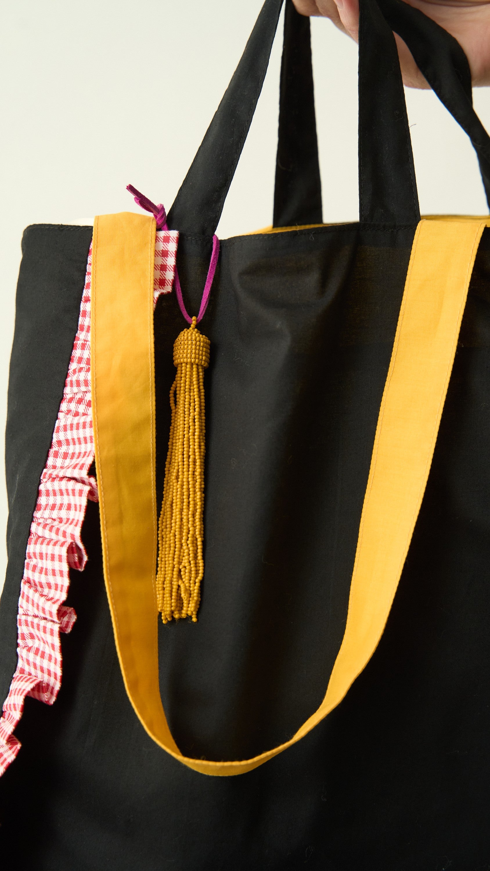Realizzata in cotone, pratica e capiente, perfetta per accompagnarti nelle attività di tutti i giorni. Il design è arricchito da rouge a contrasto sui lati, che donano movimento e un tocco di originalità. Dotata di manici sfalsati e tracolla, può essere portata comodamente a mano o a spalla, mentre l’interno include un pratico taschino con cerniera. A completare il look, una simpatica nappina colorata realizzata con piccole perline di vetro, dettaglio decorativo che aggiunge personalità e vivacità.
